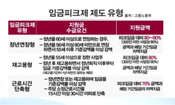 1. 정년연장형 : 근로자의 정년을 연장하는 것을 전제로 연장된 정년기간만큼 정년 전의 임금수준을 조정하는 방식