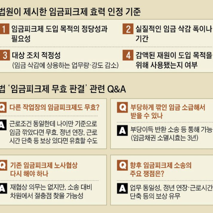 이러한 판결은 대법원이 합리적인 이유 없이 나이만을 기준으로 임금을 삭감하는 것은 연령 차별이라고 판결했기 때문으로, 이로 인하여 임금피크제를 도입했거나 계획 중인 중소기업의 혼란이 커지게 되었습니다.