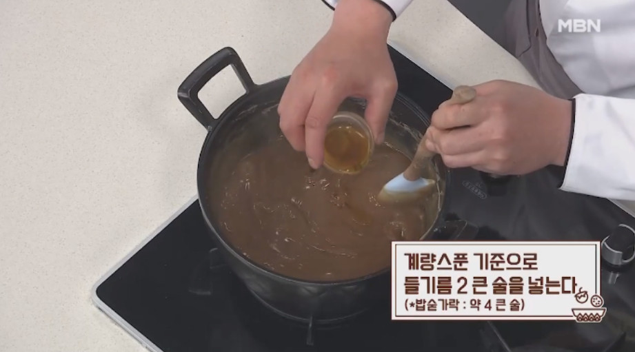 5. 다음으로 들기름도 밥 숟가락 기준으로 약 4큰술을 넣어주세요. 도토리묵을 만들 때 들기름을 넣으면 도토리의 떫은맛이 사라지고 한층 고소해진다고 해요.