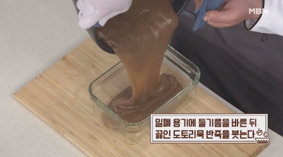 6. 이제 밀폐 용기에 들기름을 바른 뒤 끓인 도토리묵 반죽을 부어주세요.