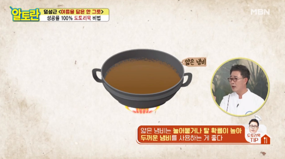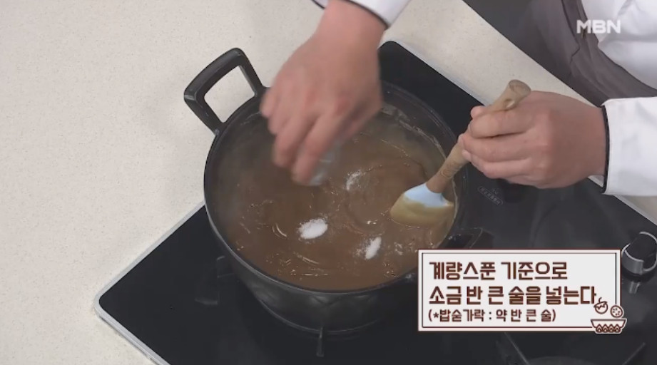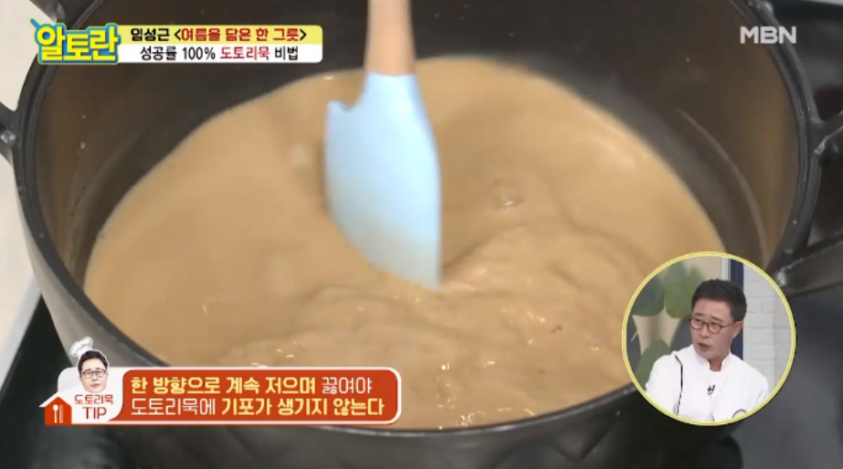 3. 얇은 냄비를 사용하면 눌어붙거나 탈 확률이 높으니 두꺼운 냄비를 하나 준비해서 도토리묵 반죽을 넣어 주세요. 여기서 임성근 요리연구가님이 알려주신 두 번째 포인트! 바로 도토리묵 반죽을 한 방향으로 계속 저어가면서 끓이는 거예요. 이렇게 하면 도토리묵에 기포가 생기지 않는다고 해요.