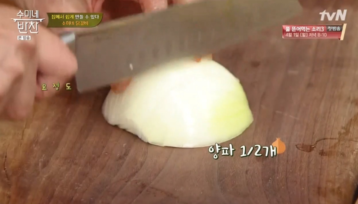 10. 이제 채소를 손질할 차례입니다. 양파 반 개를 썰어 주세요.