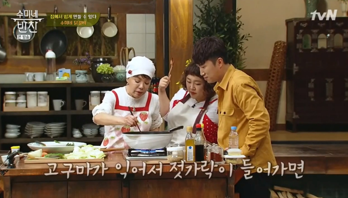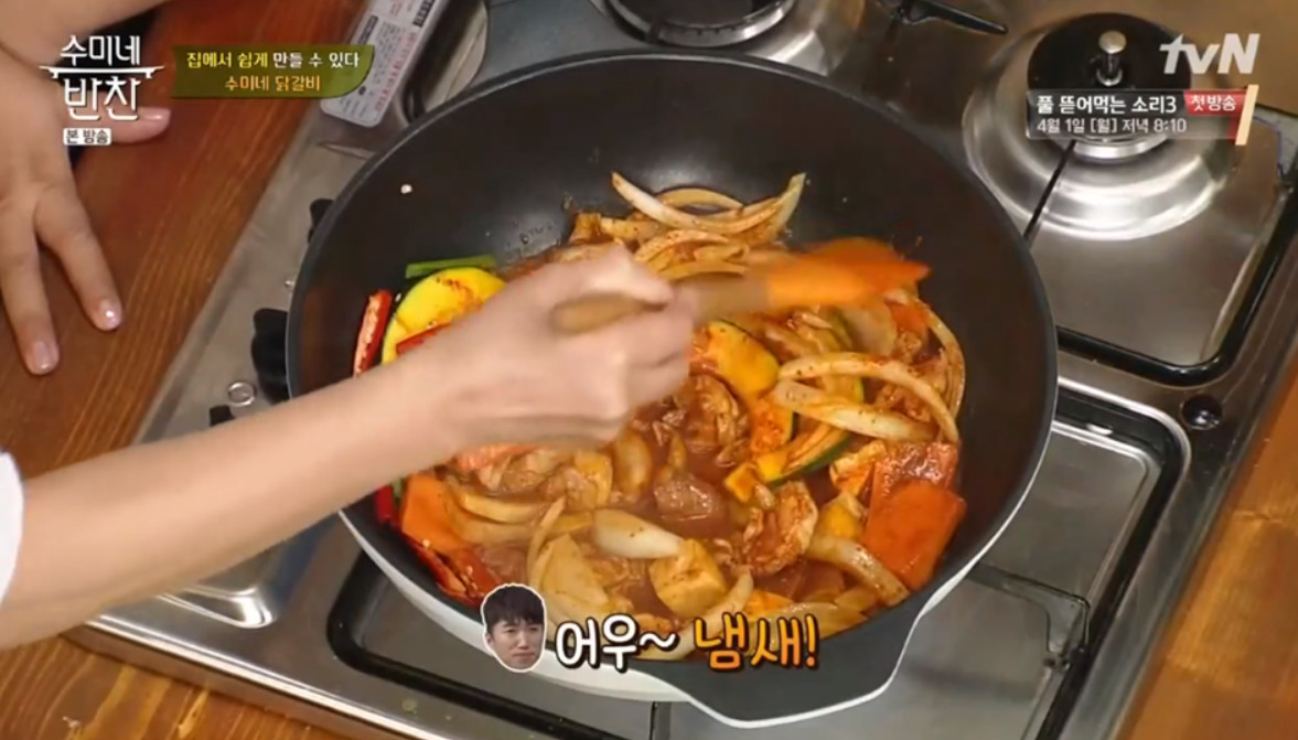 24. 마지막으로 길게 썬 깻잎을 넣으면 김수미식 닭갈비가 완성됩니다.