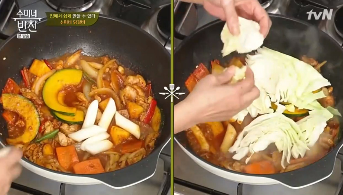21. 고구마가 익어 젓가락이 쉽게 들어가면, 떡과 양배추를 추가해 주세요.