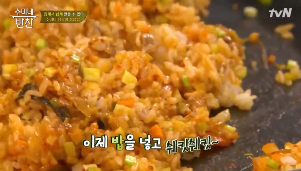 그다음, 밥을 넣고 잘 볶아주면 간단하게 닭갈비 볶음밥이 완성됩니다.