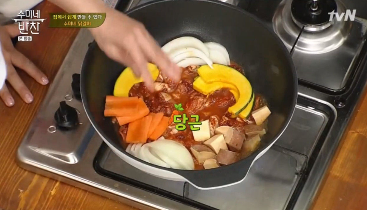 20. 손질한 당근, 양파, 고추, 단호박을 모두 넣어 주세요.