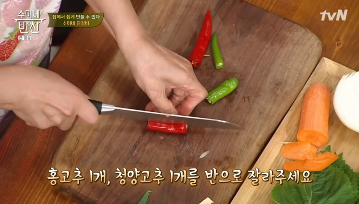 15. 홍고추 1개와 청양고추 1개는 길게 반으로 잘라 주세요.