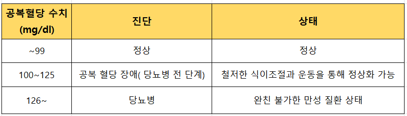 공복 상태에서 혈당을 측정했을 때, 100mg/dL 미만이면 정상으로 간주되며, 126mg/dL 이상일 경우 당뇨병으로 진단됩니다.