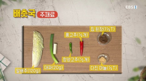 알배추(120g), 대파(20g), 청양고추(½개), 홍고추(½개), 집된장(1½큰술), 다진마늘(½큰술) 멸치육수내기 : 물(700ml), 무(100g), 양파(70g), 국멸치(15g), 건새우(5g), 다시마(10g, 조각)
