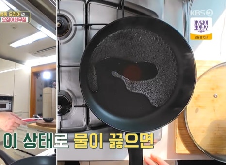 후라이팬에 물 50ml를 붓고, 물이 끓기 시작하면 손질한 오징어를 넣습니다.