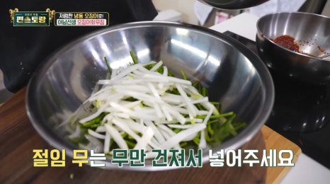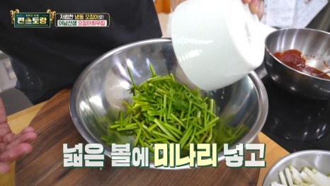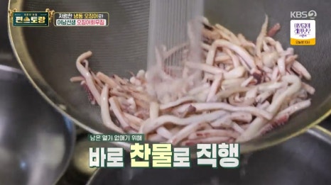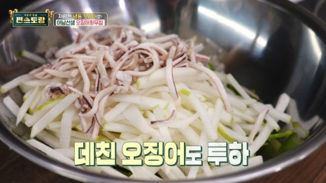 대구에는 오징어무침 골목이 있는데, 류수영 어남선생님께서 냉동오징어를 이용해 집에서도 간편하게 만들 수 있는 방법을 알려주셨어요. 아삭한 미나리와 새콤한 무절임이 들어가서 술안주로도 완벽할 것 같은데요. 그럼 이제 편스토랑 오징어초무침 황금레시피를 알려드릴게요.