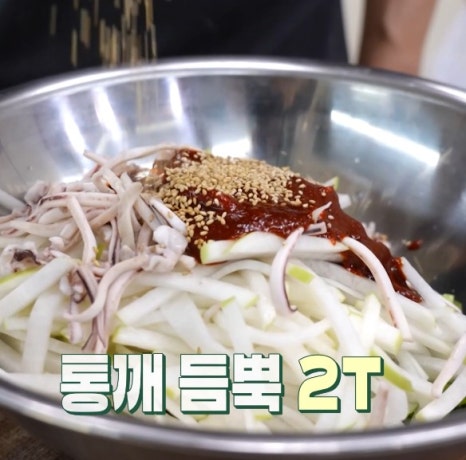 여기에 양념장 7큰술과 통깨 2큰술을 넣고 손으로 잘 버무리면 어남선생 오징어무침회가 완성됩니다.