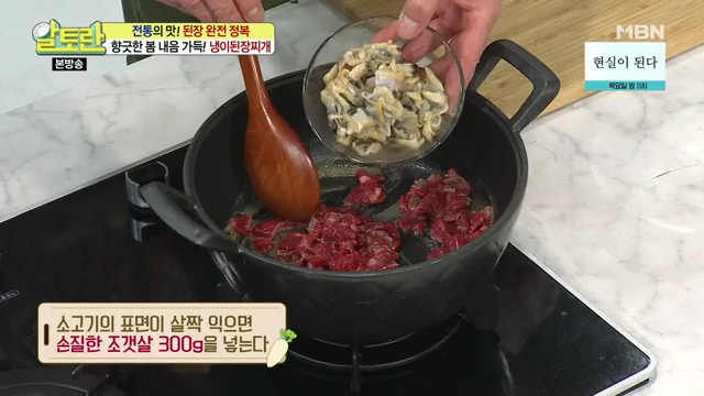 이제 본격적으로 냉이된장국을 만들 거예요. 조갯살과 소고기를 넣으면 시원하면서도 고소한 맛을 동시에 낼 수 있고, 영양도 챙길 수 있다고 해요. 준비할 재료는 조갯살 300g, 찌개용 소고기 150g, 그리고 참기름이에요.