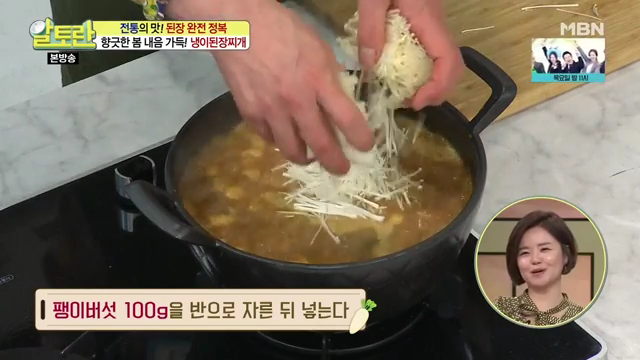 냉이된장찌개에서 빼놓을 수 없는 중요한 재료는 바로 생강즙이에요. 생강즙이 잡내를 없애주고, 국물 맛을 훨씬 깔끔하게 만들어 준다고 하네요. 그리고 팽이버섯은 반으로 자르고 넣어주면 좋습니다.