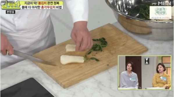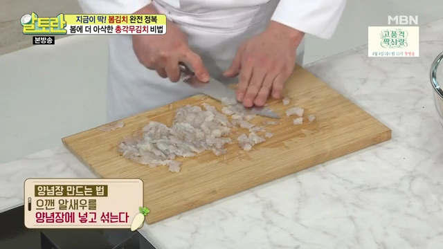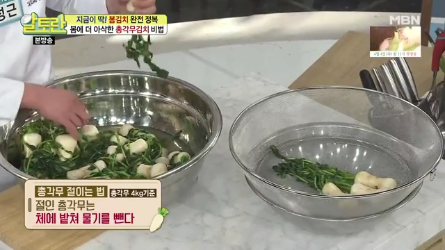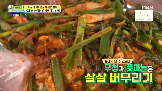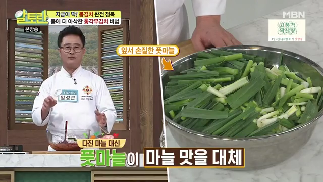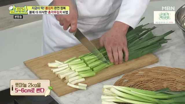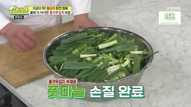보통 부재료로 쪽파나 부추를 많이 넣지만, 알토란에서는 풋마늘을 넣네요. 파와 마늘의 맛과 향을 동시에 지닌 풋마늘은 비타민C가 풍부해서 면역력 강화와 피로 회복에 도움을 준다고 해요. 총각무와도 잘 어울리는 재료죠. 풋마늘 2kg을 준비해 듬성듬성 썰어서 준비합니다.