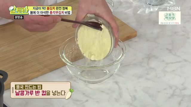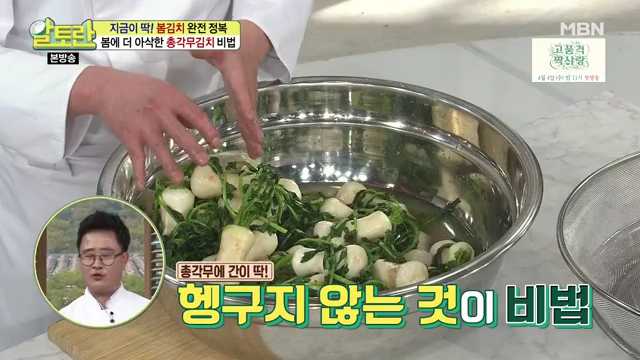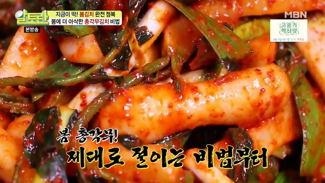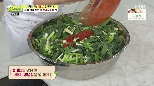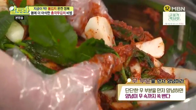 알토란표 총각무김치에는 풋마늘이 들어가고, 절임물에 설탕이 이미 들어가 있어 충분히 단맛이 배어 있어요. 그래서 별도로 설탕이나 다진 마늘은 넣지 않습니다^^