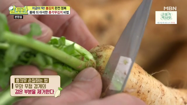 싱싱하고 좋은 총각무는 뿌리는 굵고 위로 갈수록 날씬해야 하며, 손으로 만졌을 때 단단한 것이 좋아요. 또, 무청이 너무 길면 맛이 떨어지기 때문에 짧은 것을 고르는 것이 좋아요.