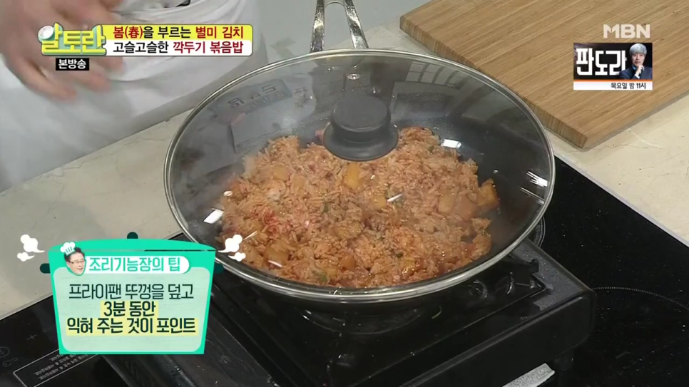 밥알에 깍두기 국물이 고르게 배면 불을 약하게 줄이고, 팬에 뚜껑을 덮은 후 3분 동안 익혀줍니다.