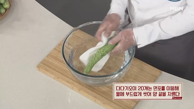1. 먼저 다다기오이 20개를 준비한 후, 면포를 사용해 물로 부드럽게 씻어 주세요.