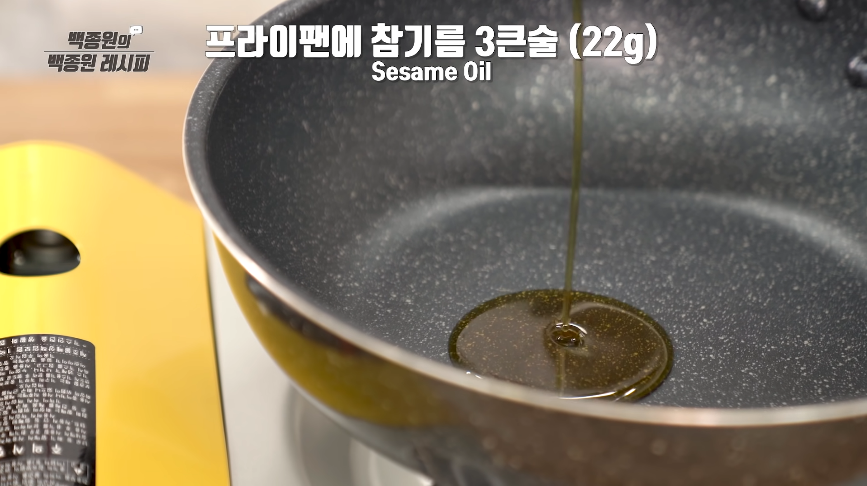 7. 프라이팬에 참기름과 대파를 넣고 중불에서 볶아 파기름을 내주세요.
