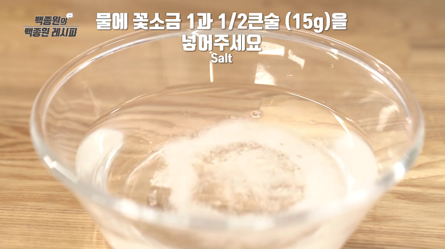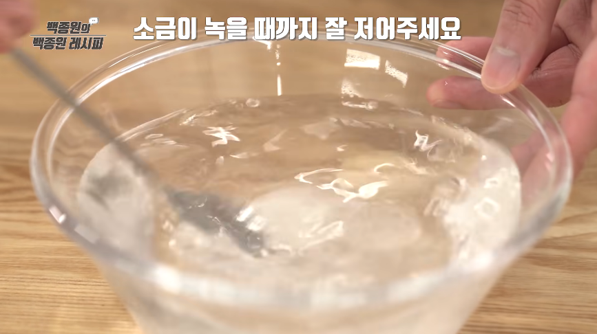 2. 소금물은 꽃소금과 물을 사용하여 소금이 완전히 녹을 때까지 잘 섞어준 뒤, 도라지를 넣고 약 1시간 동안 담가 쓴맛을 없앱니다.