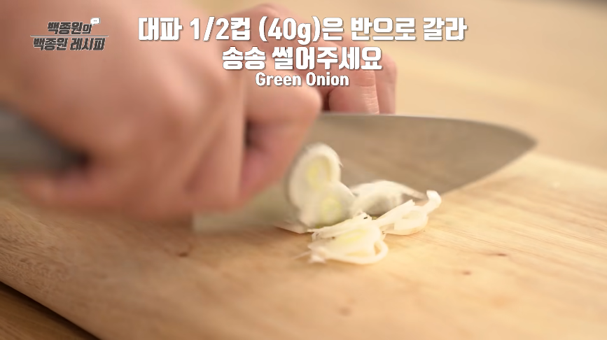 6. 대파는 길게 반으로 자른 후, 송송 썰어 준비해 주세요.