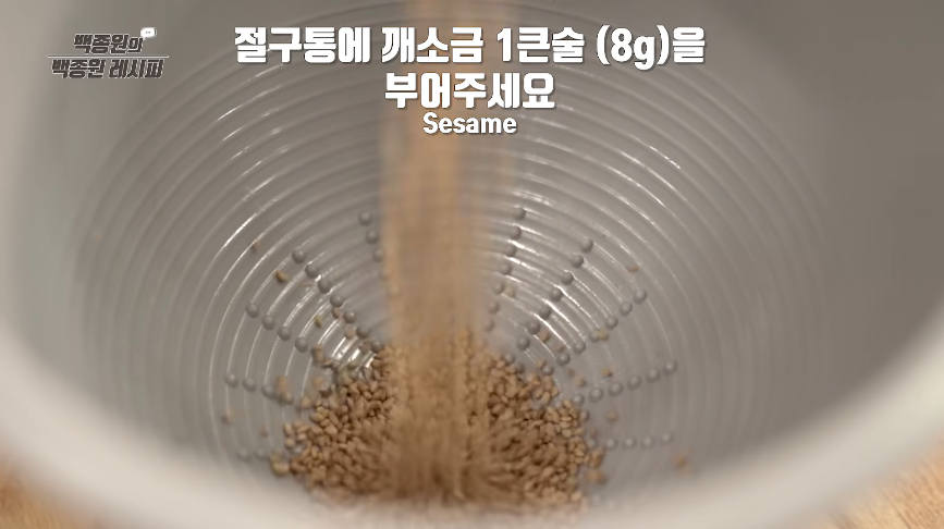 1. 먼저 도라지나물 만들기에 꼭 필요한 비법 재료, 깨소금을 준비해 주세요. 깨소금 1큰술을 절구에 넣고 곱게 갈아줍니다. 직접 갈아 사용하면 약간 번거로울 수 있지만, 이렇게 하면 풍미가 훨씬 더 좋아진답니다.