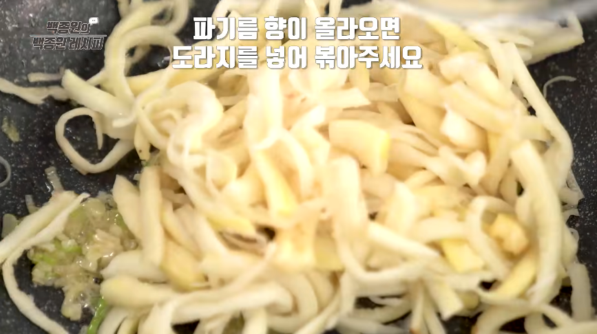 8. 파기름 향이 솔솔 올라오면, 도라지를 넣고 잘 볶아 주세요.