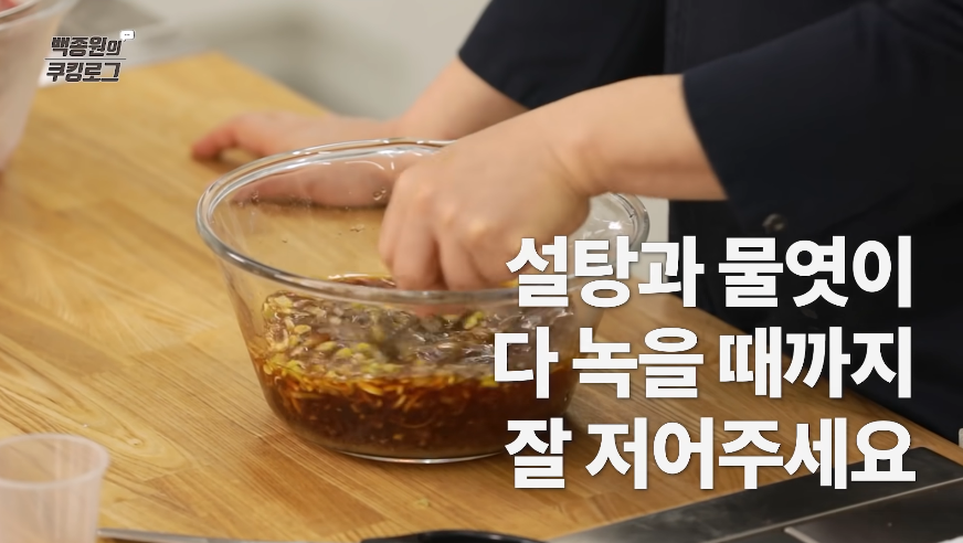 4. 네 번째로, 섞은 양념장은 계속 저어가며 설탕을 녹여 주세요. 설탕이 모두 녹으면 참기름을 넣고 잘 섞어주세요.