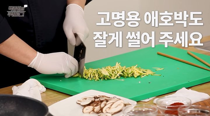 9. 아홉 번째로, 고명을 준비할 차례인데요, 양파, 애호박, 당근, 표고버섯은 예쁘게 채 썰어주세요.