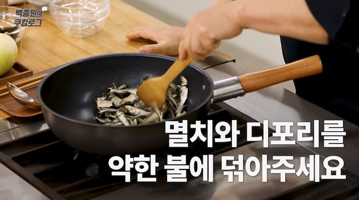 2. 두 번째로, 약불로 냄비를 살짝 달군 후 멸치와 디포리를 넣고 볶아주세요.