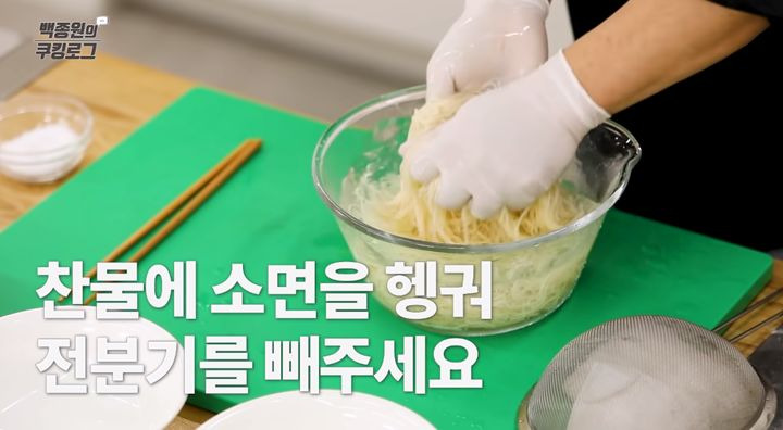 13. 열세 번째로, 삶아진 소면은 체에 밭쳐 건져내고, 찬물에 헹궈서 전분기를 빼주세요.