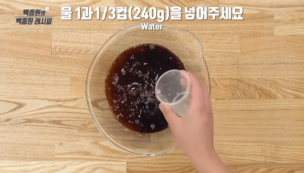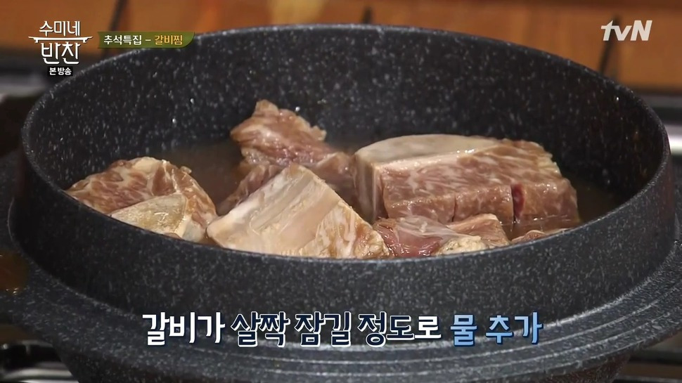 13. 갈비가 살짝 잠길 정도로 물을 부어 주세요. 그 후, 맛을 보고 간장을 추가해 주세요.
