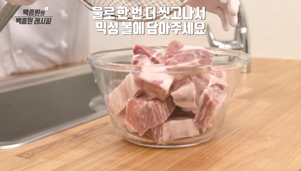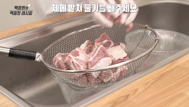 6. 소갈비 2kg을 체에 밭쳐 핏물을 깨끗이 제거해 주세요.