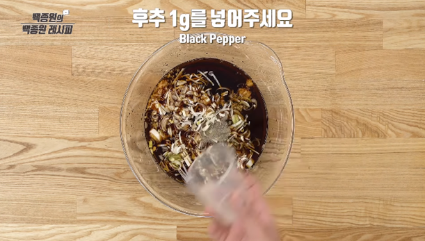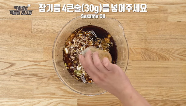 4. 잘게 썬 대파 2/3컵(50g), 후추 1g, 참기름 4큰술(30g)을 넣고 골고루 섞어 주세요.