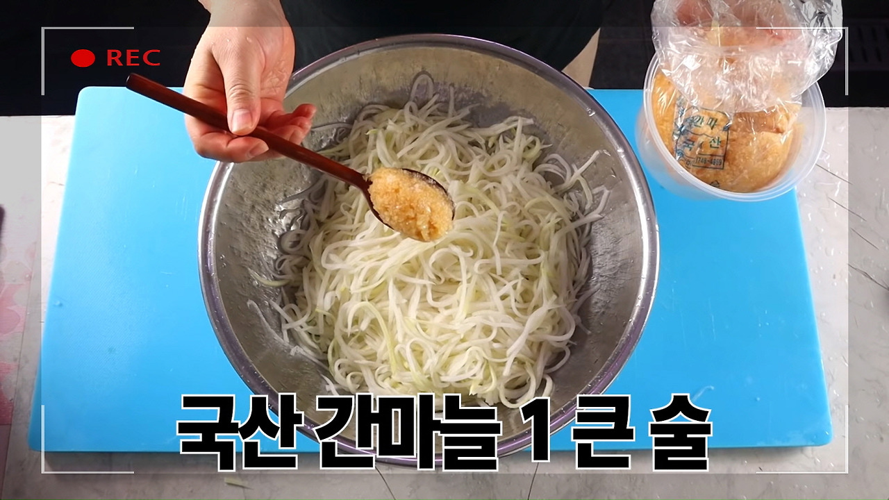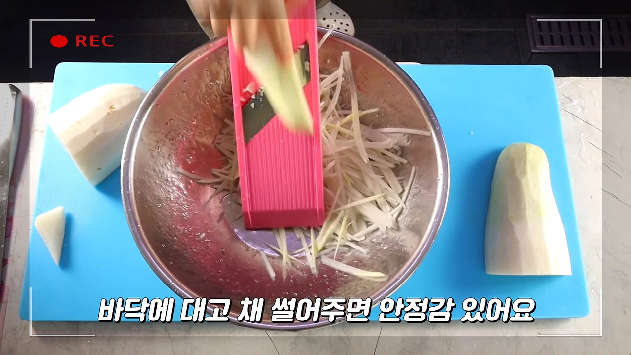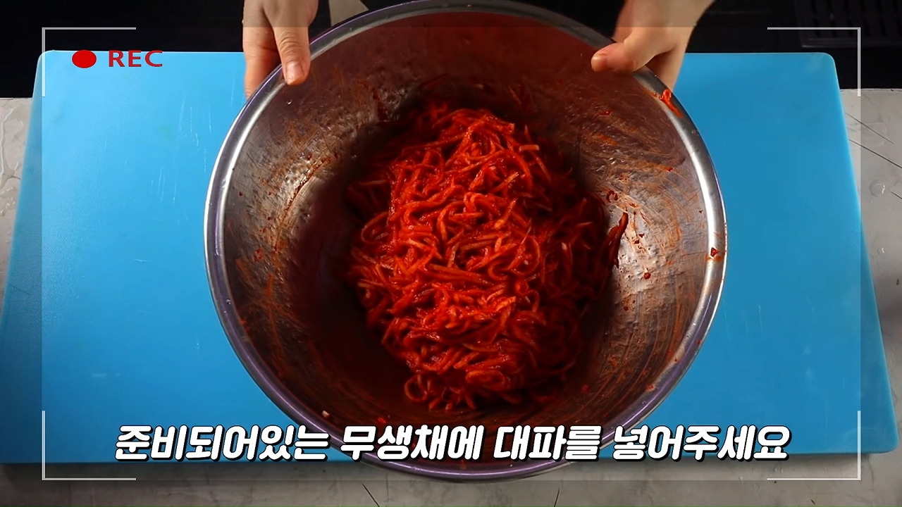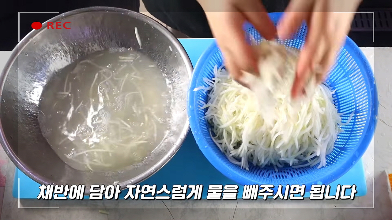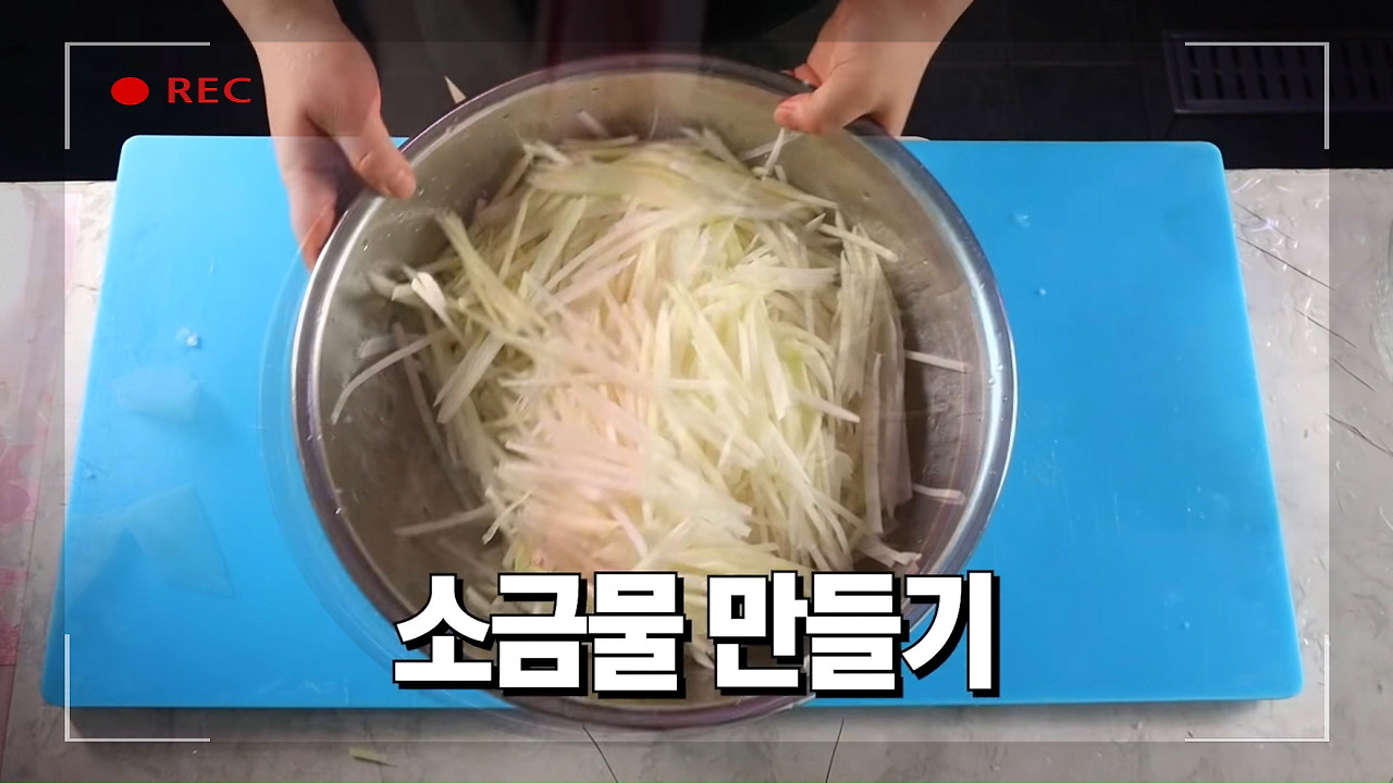 채 썰어둔 무에 소금의 염분이 스며들며 간이 배는 시간이므로, 이 과정은 특히 신경 써서 해주는 것이 좋습니다.