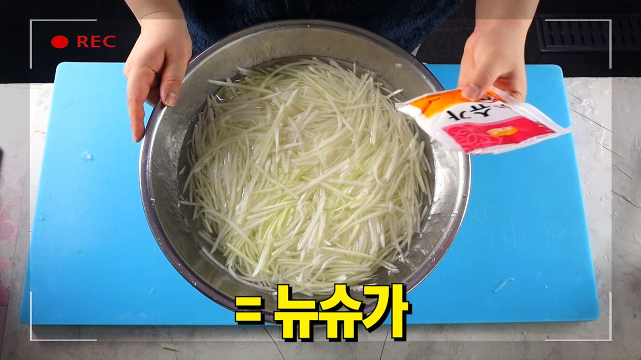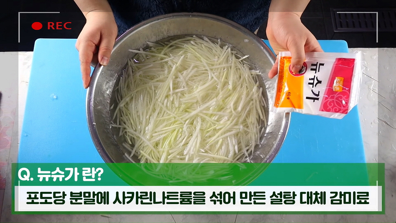 오늘 무생채를 맛있게 만드는 비법 재료는 바로 '뉴슈가'입니다. 뉴슈가는 포도당 분말에 사카린나트륨을 섞어 만든 설탕 대체 감미료인데요, 한때 발암물질 논란이 있었지만, 연구 결과 인체에 무해한 것으로 밝혀졌습니다.