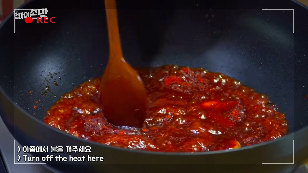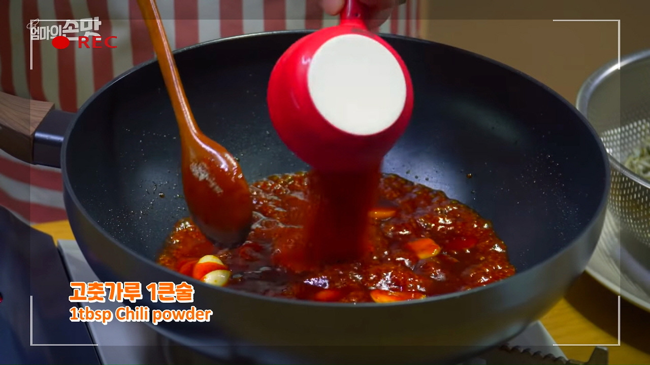 이어서 고추가루 1큰술을 넣고, 불을 꺼주세요. 이렇게 하면 멸치볶음에 매콤한 맛이 추가됩니다. 벌써 거의 다 끝났습니다! 이제 멸치볶음 맛있게 만드는 법의 마지막 단계로 넘어가겠습니다.