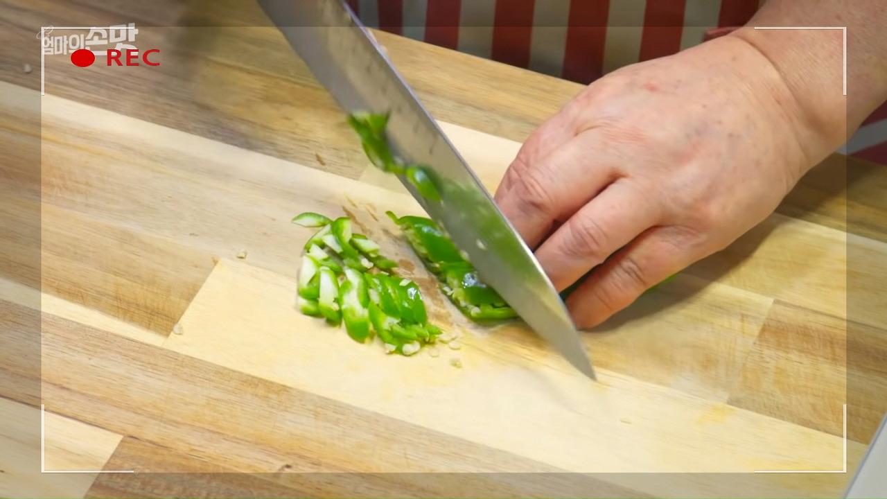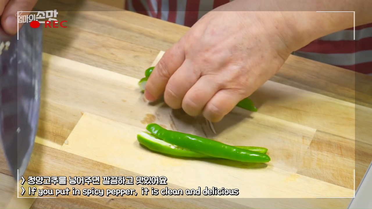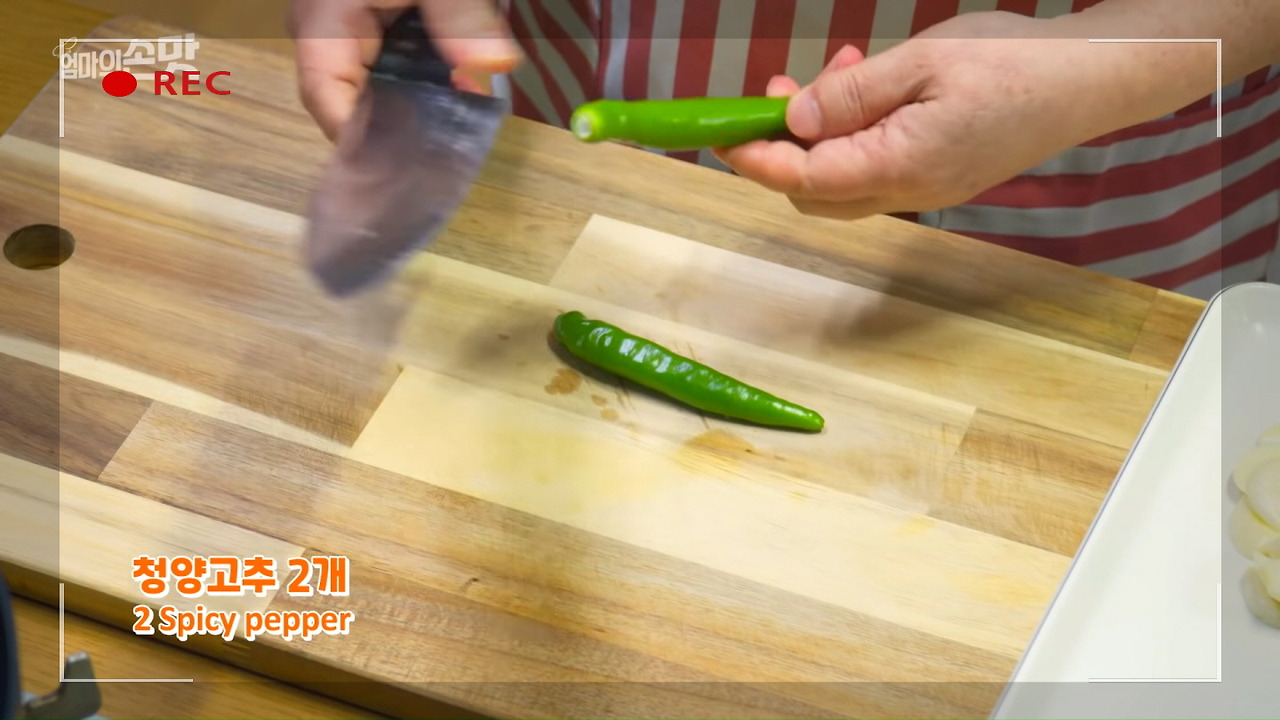 멸치볶음에 넣을 청양고추도 반으로 갈라서 얇게 어슷썰기 해주세요. 청양고추가 들어가면 약간 매콤해지고, 깔끔해지며, 식감과 비주얼도 더해줍니다.