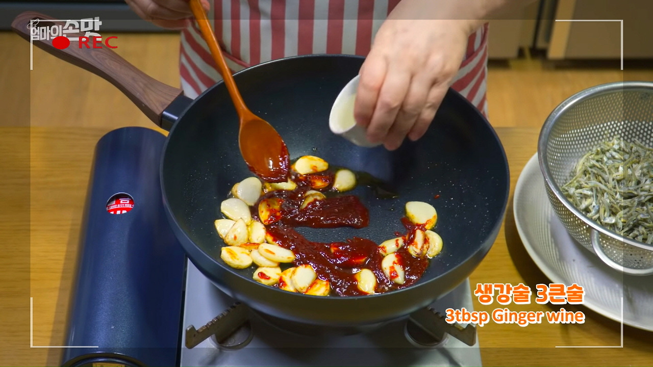 그 후 고추장 2큰술, 생강술 2큰술을 넣고 잠시 볶아주세요. 생강술이 없다면 청주, 소주, 미림 등 아무거나 사용해도 좋습니다. 이렇게 하면 멸치에 남아 있을 비린내를 깔끔하게 날려주어 더욱 깔끔한 멸치볶음을 만들 수 있습니다.