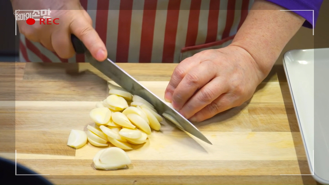 멸치볶음에 들어갈 마늘은 편썰기로 얇게 썰어주세요. 편마늘의 식감과 특유의 고소한 맛이 멸치볶음을 더욱 맛있게 만들어줍니다.