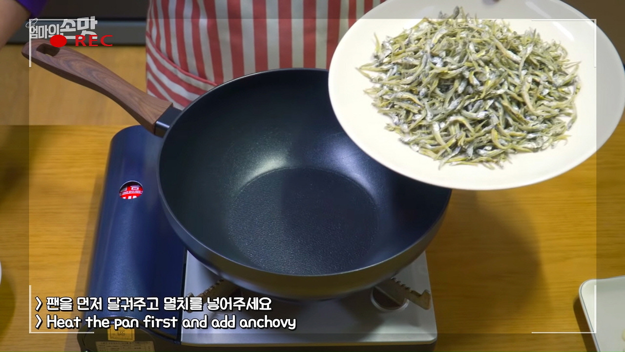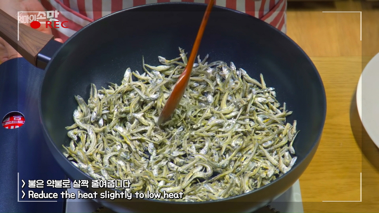달궈진 팬에 멸치를 넣은 후, 곧바로 약불로 줄여주세요.