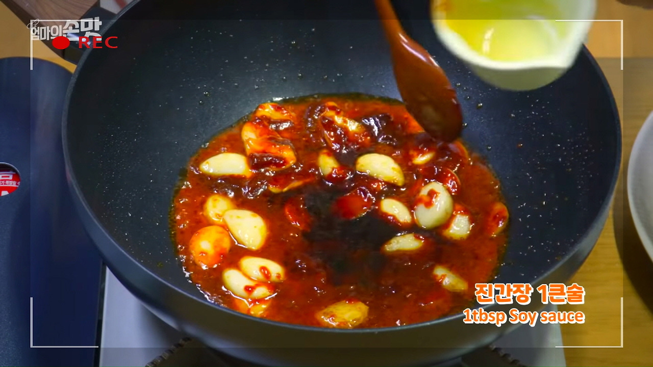 그다음 진간장 1큰술을 넣어 멸치볶음의 전체적인 간을 맞춰주세요.