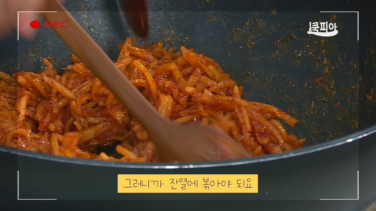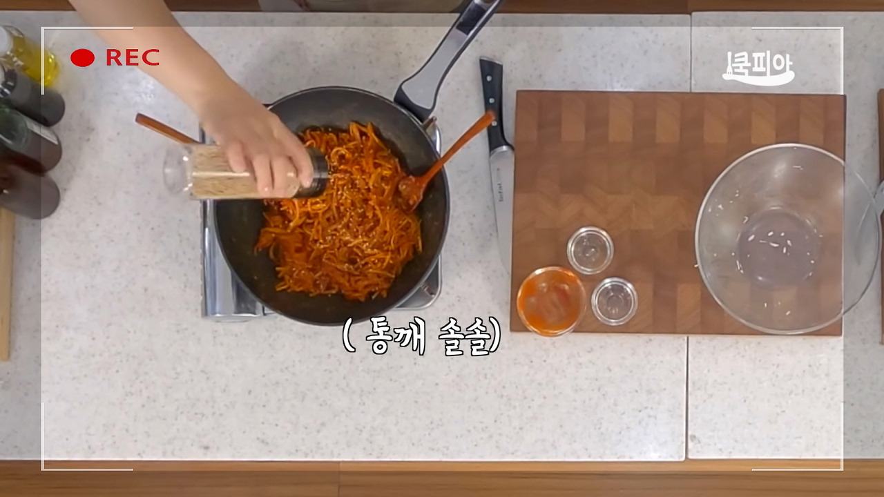 1분간 가열한 후 살살 털어주며 알코올 성분을 잘 날려주셨다면, 이제 진미채볶음 황금레시피의 다음 단계를 살펴보겠습니다.