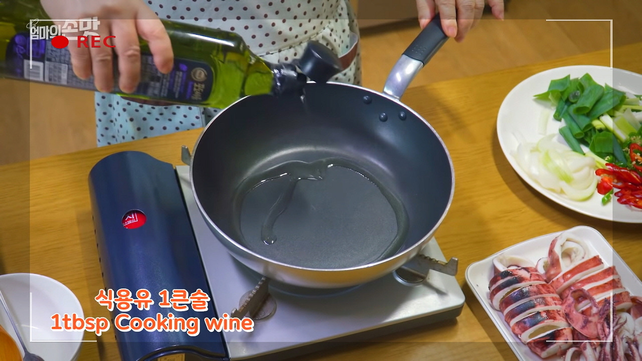 뜨겁게 달궈진 냄비에 오징어를 넣고, 청주나 소주 2큰술을 넣어주면 오징어의 잡내를 깔끔하게 제거할 수 있습니다.
