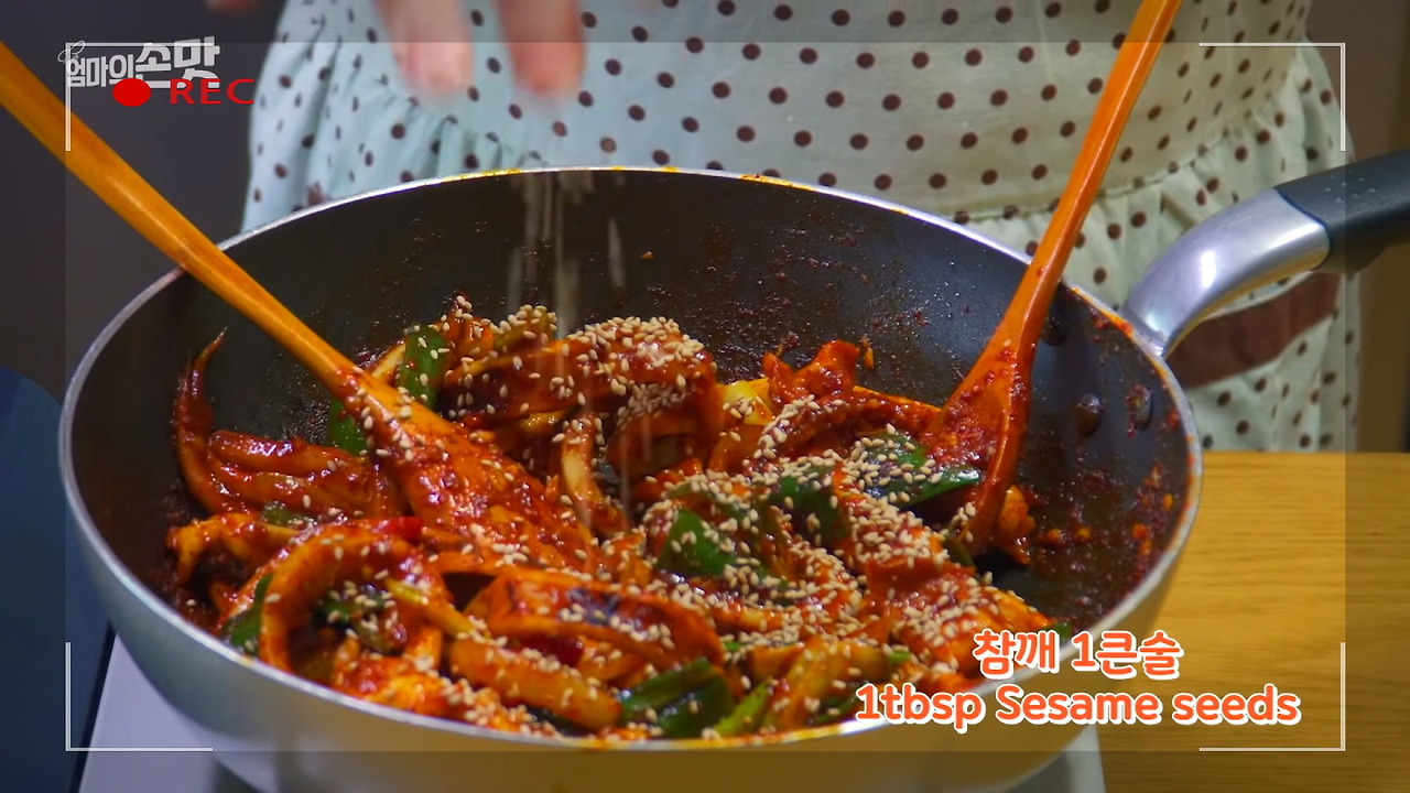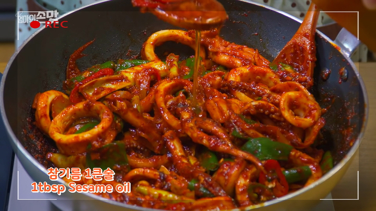 이렇게 볶아낸 오징어볶음에 불을 끄고, 참기름 1큰술과 참깨 1큰술을 넣어 마무리해주면 오늘의 오징어볶음을 맛있게 만드는 모든 과정이 완성됩니다.