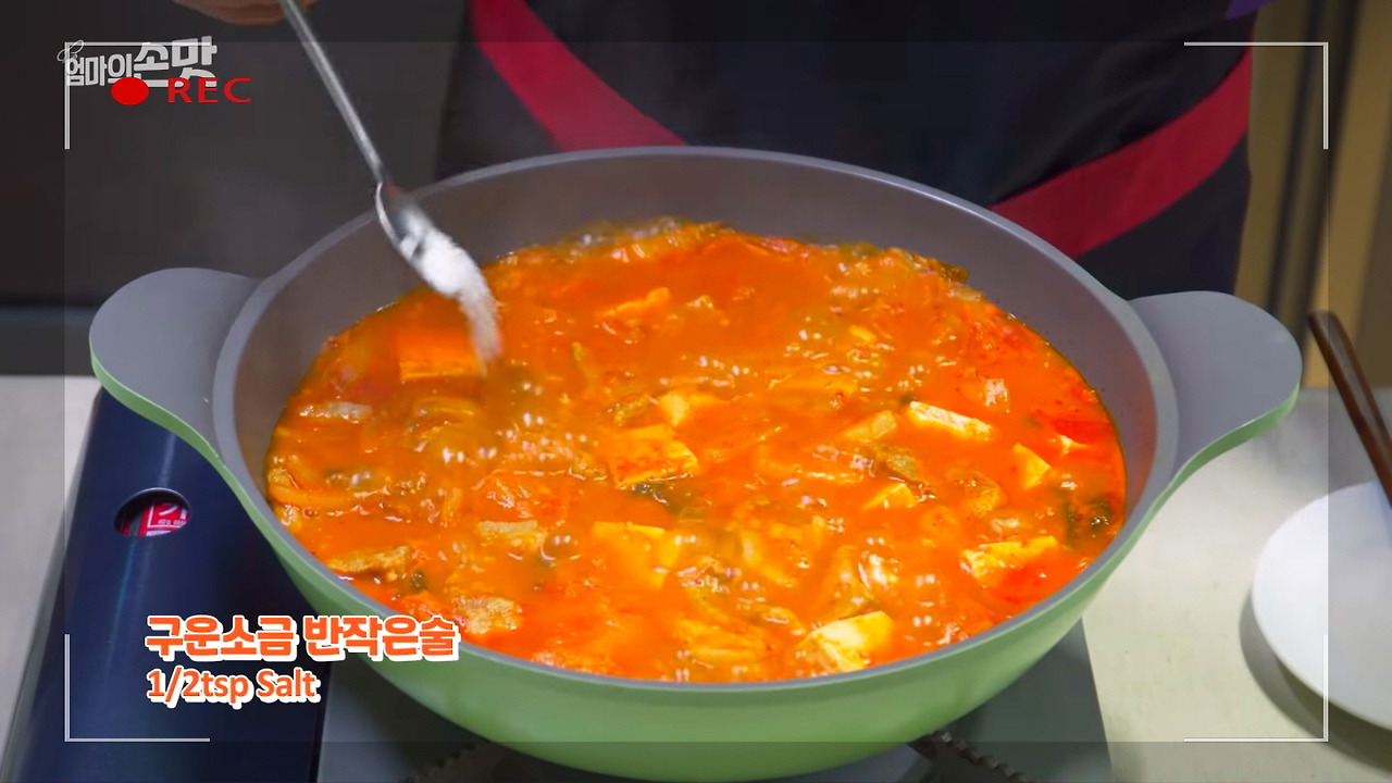 마지막으로 구운소금 반 티스푼으로 간을 맞춰준 뒤, 썰어둔 대파를 넣어 마무리해줍니다. 이렇게 하면 오늘의 김치찌개 맛있게 만드는 방법이 모두 완료됩니다.
