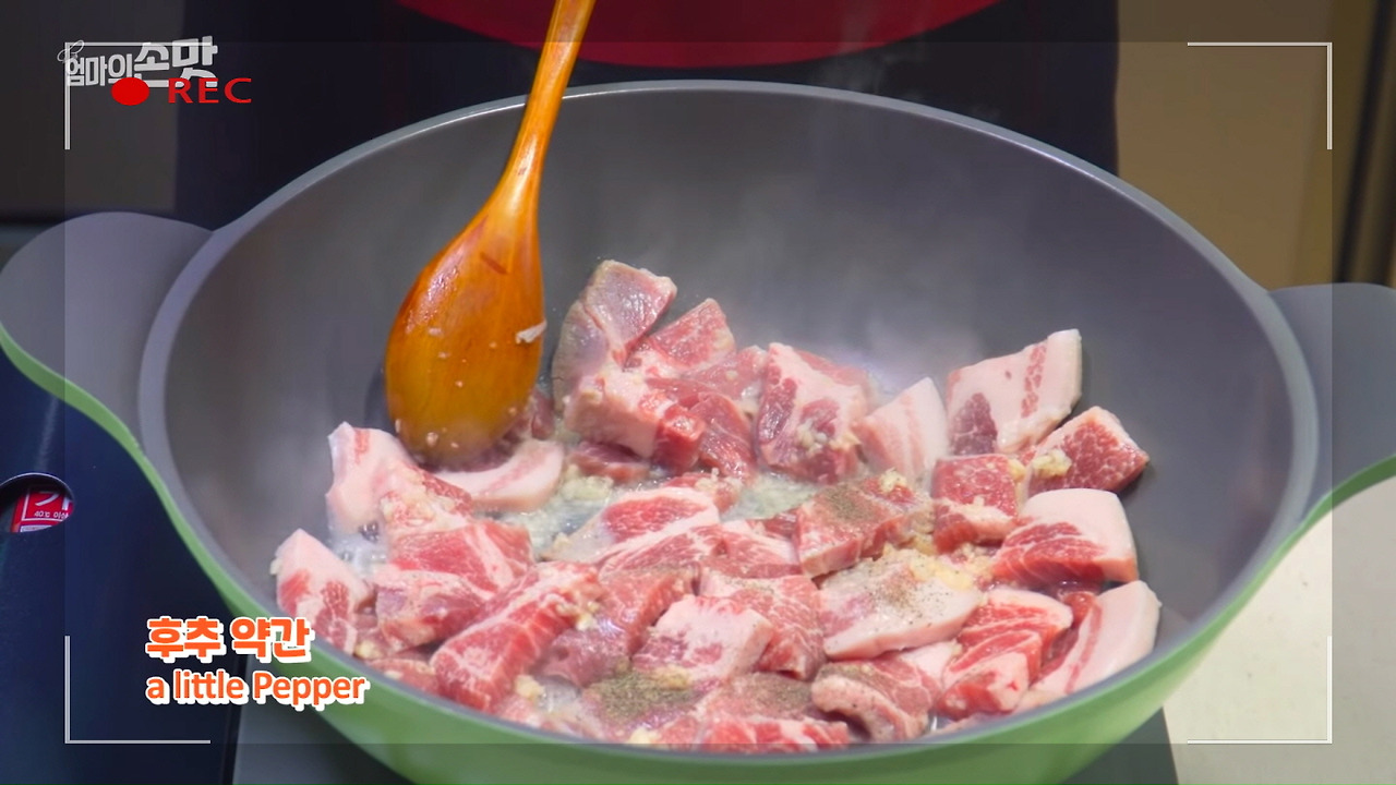 후추도 약간 뿌려주어 돼지고기 김치찌개에 풍미를 더해줍니다. 돼지고기에 어느 정도 색이 돌기 시작하면, 미리 썰어둔 김치를 넣어 함께 볶아주세요.