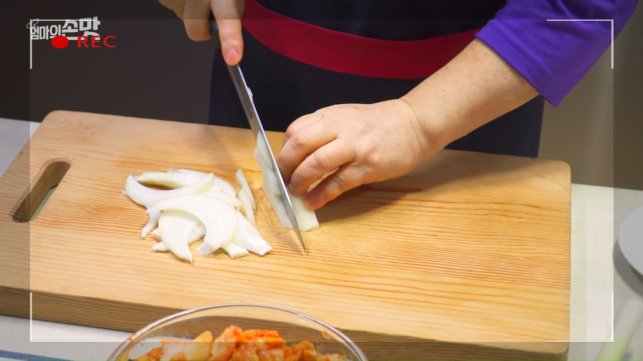 김치찌개에 들어갈 양파도 슬라이스로 얇게 썰어줍니다. 양파는 김치찌개에 은은한 단맛과 부드러운 식감을 더해주는 역할을 합니다.