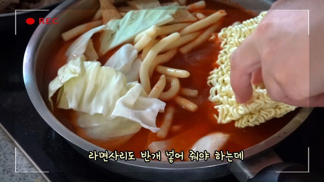 라면사리가 있다면 반 개 정도 넣어주시고, 라면을 좋아하신다면 한 개를 다 넣어주셔도 좋습니다.